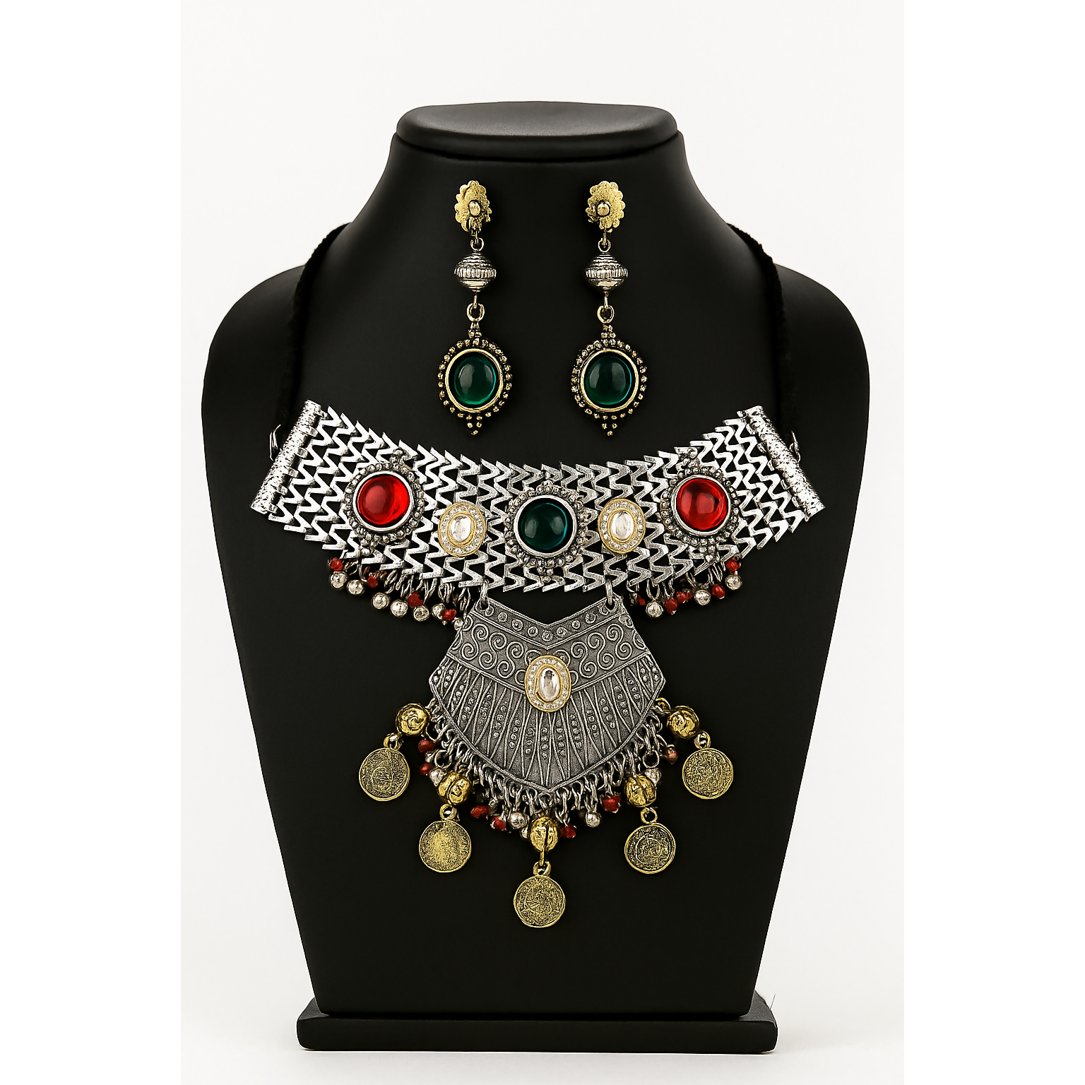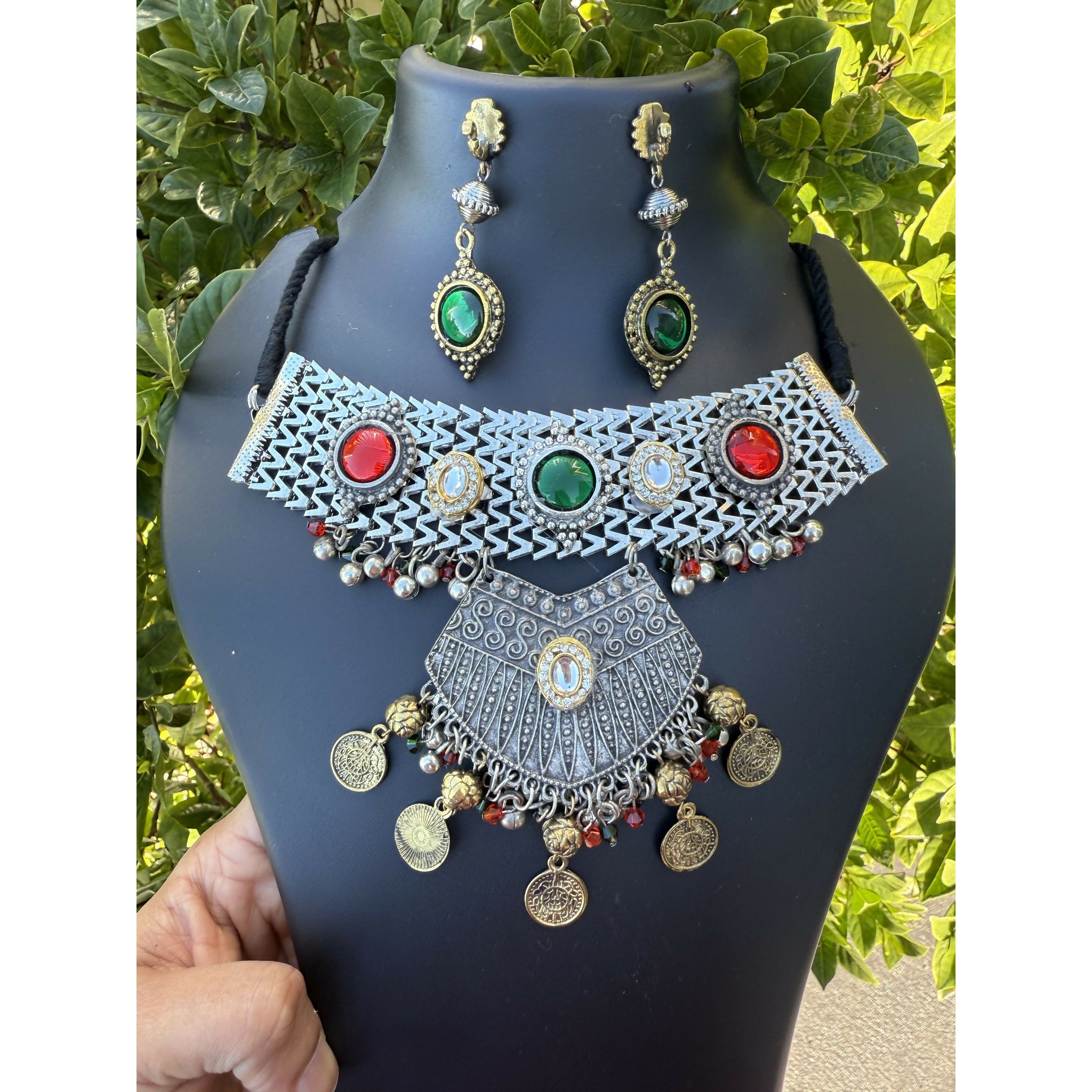 Elevate your festive look with our handcrafted finish choker set, featuring vibrant stones and antique coin drops β a perfect blend of tradition an...